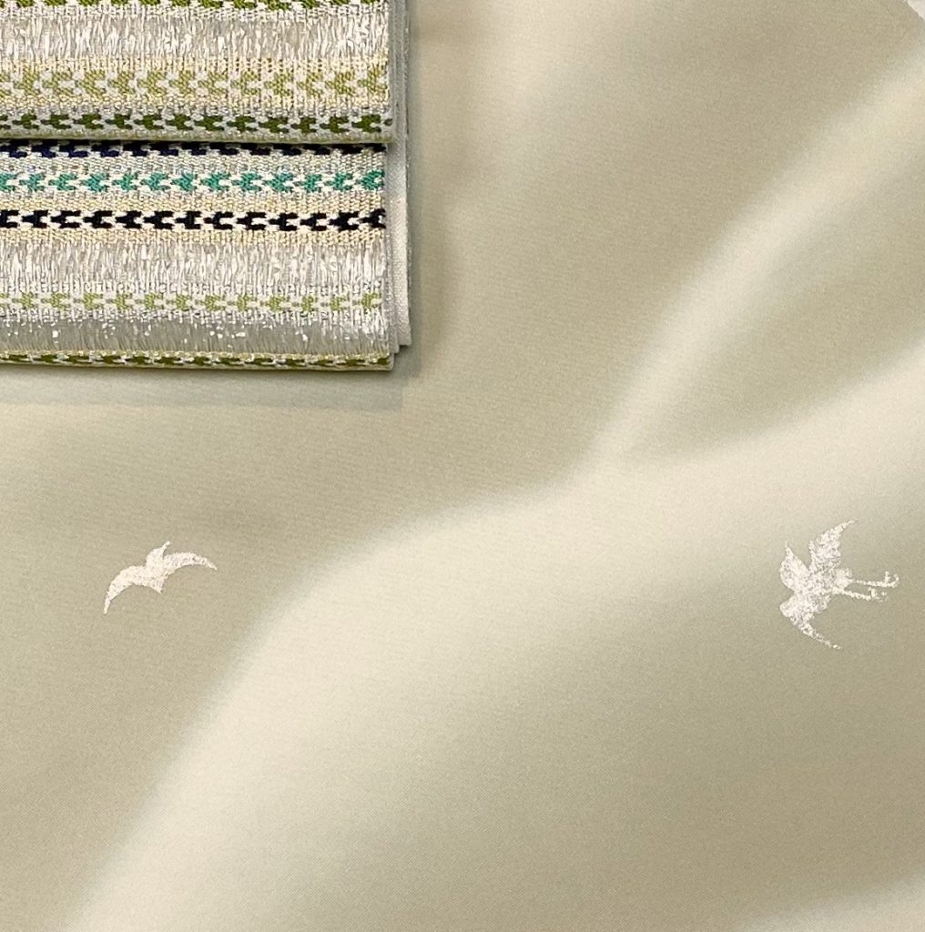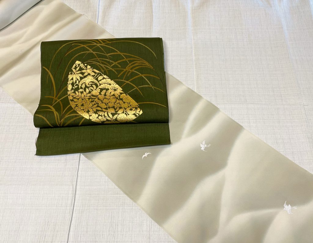 お洒落使いのコーデだから、三日月の摺箔が金で、着物の鳥たちが銀でも、