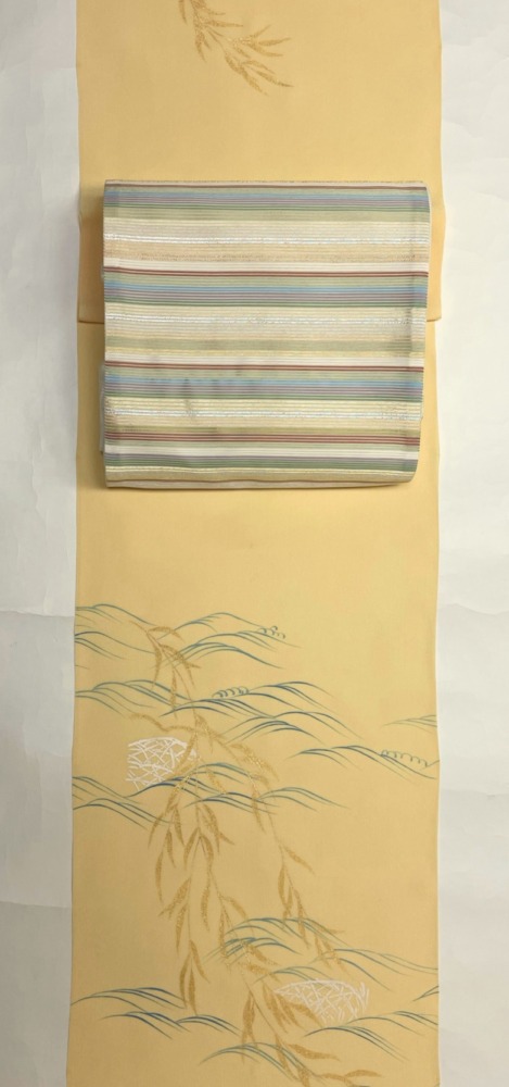 柄はシンプルな夏袋帯、紬から夏の付下までいろいろなお召し物にも代用できる幅広い帯。