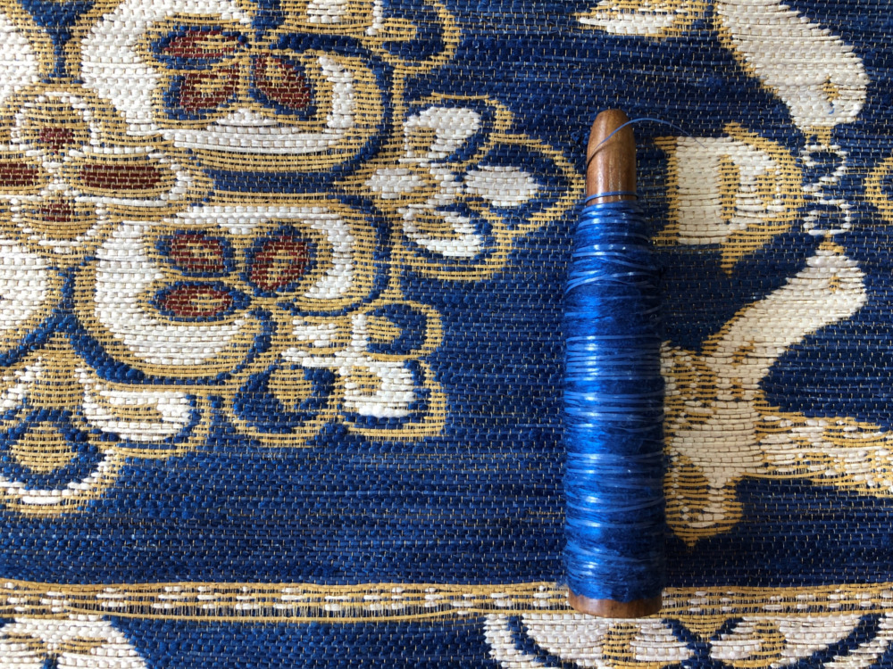 こちらのように、比較的鮮やかな青色の緯を入れても、織り上がった生地は落ち着いた青色になります。