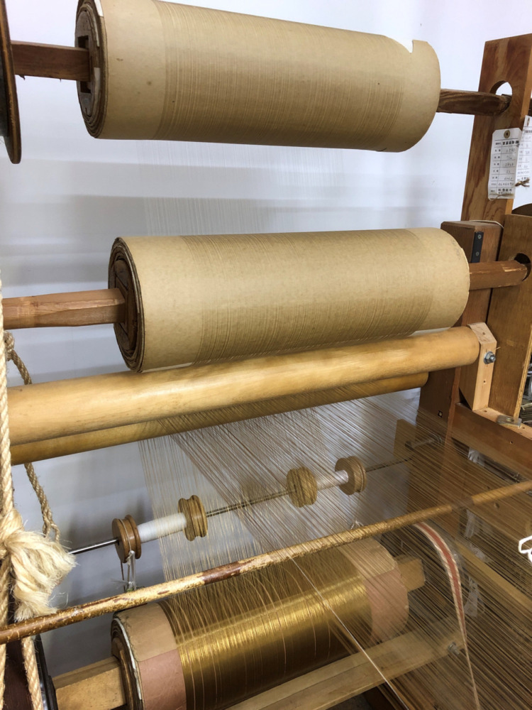 金糸の経糸と、からみと呼んでいる細い絹の経糸が別々のちきりに巻かれています。