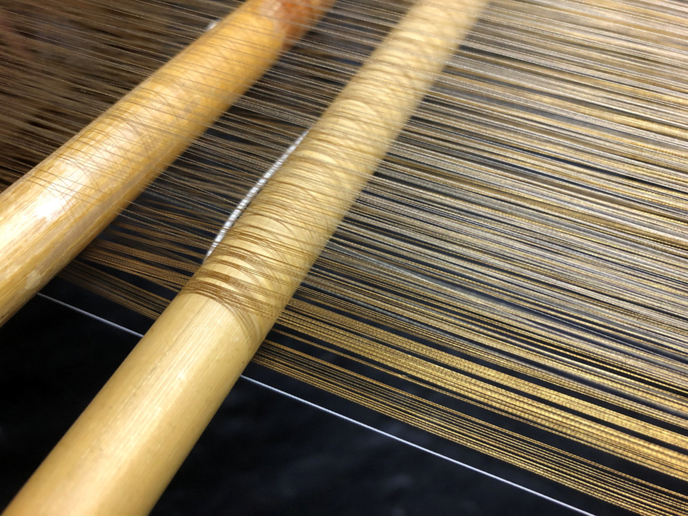 私は金糸の経糸の金綜機で作業しています。