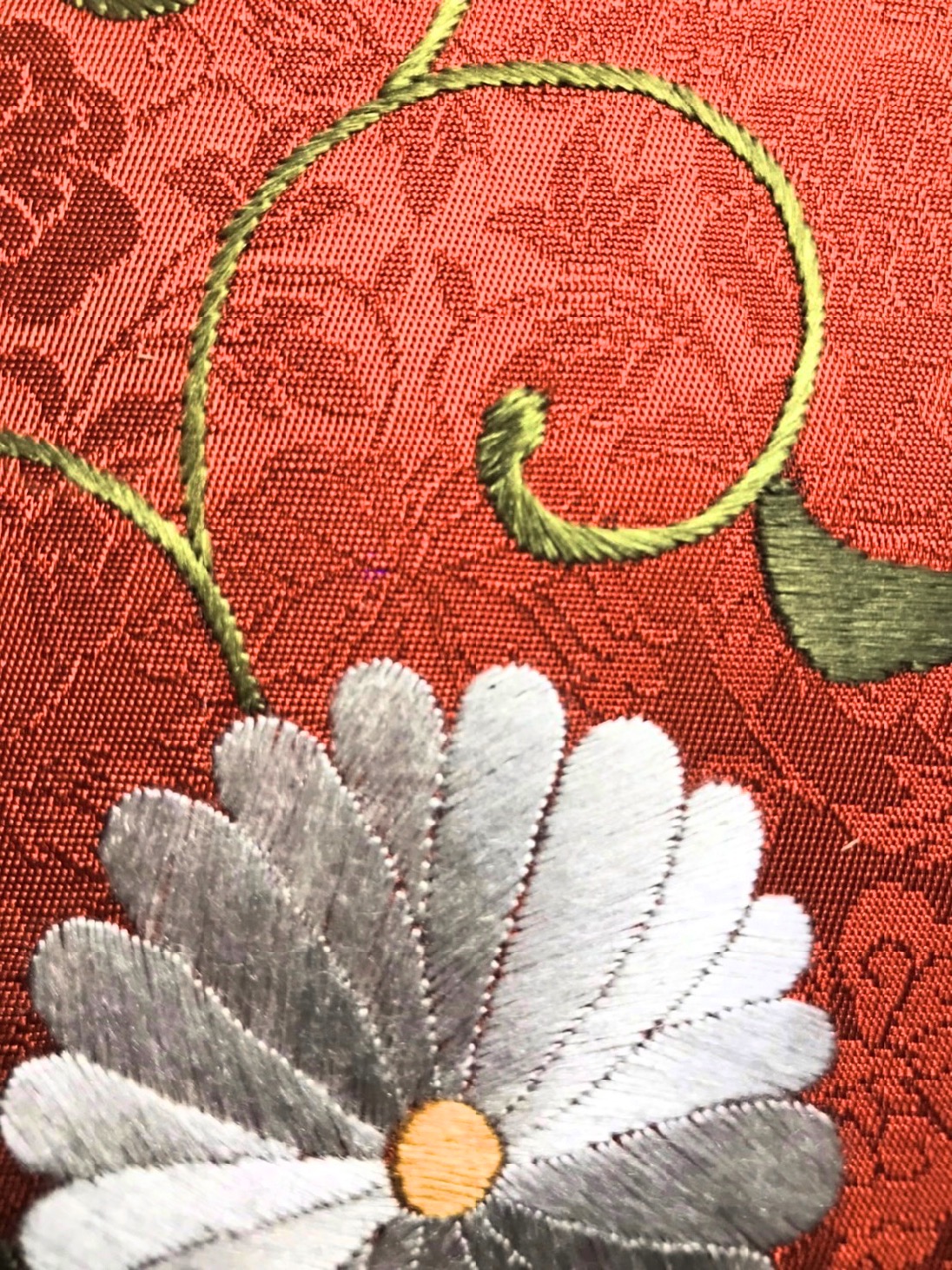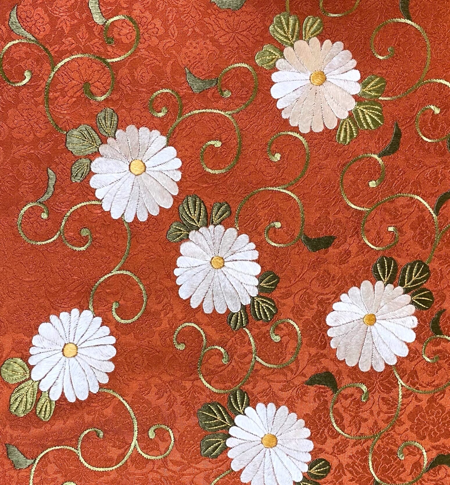 先日も今手掛けている織名古屋帯菊唐草文の刺繍が出来上がったので職人のところまでそれを見にいったが、