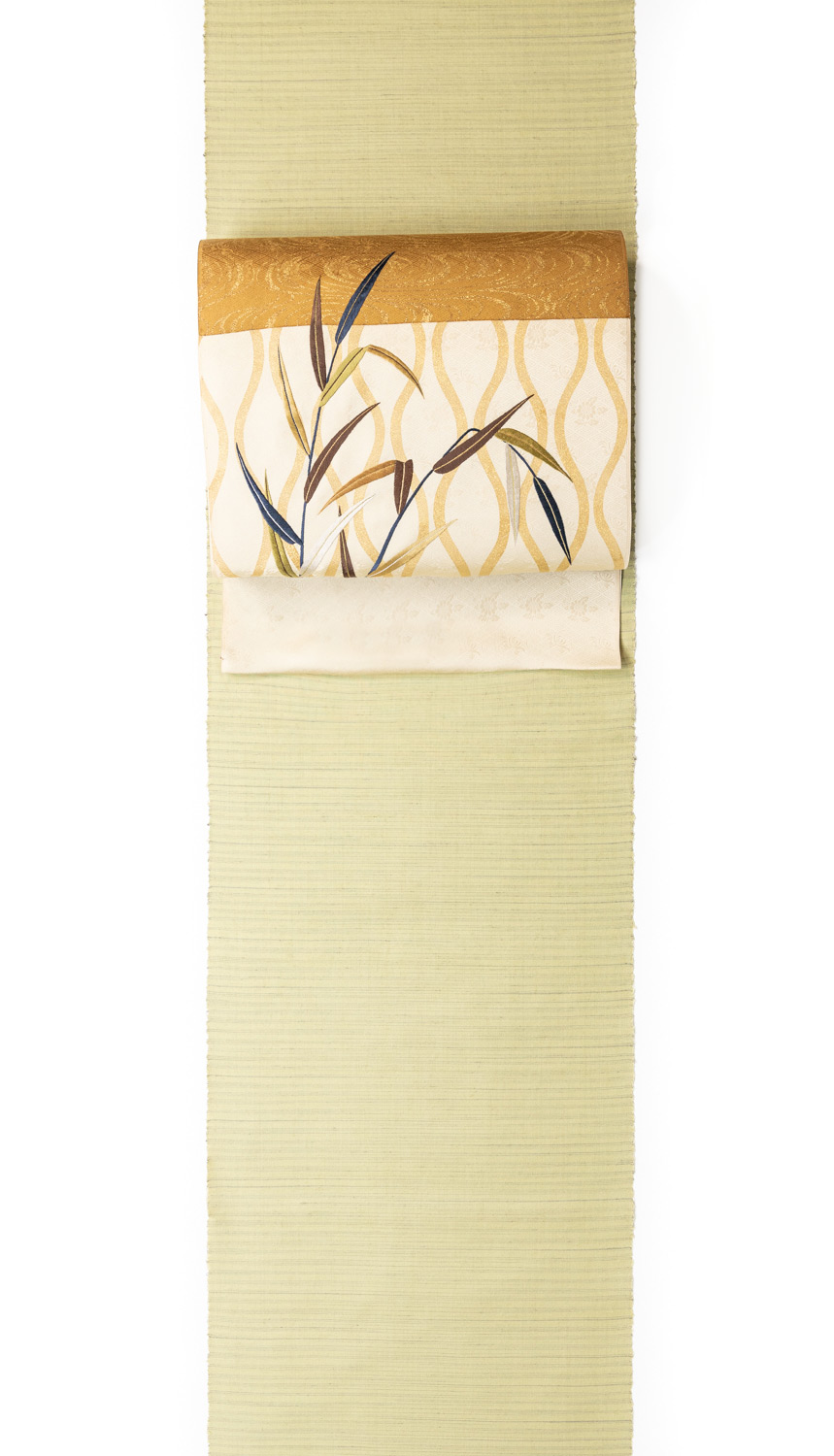 帯は綸子、生成り地 上には摺箔の流水、そこから立涌の摺箔がのびやかに