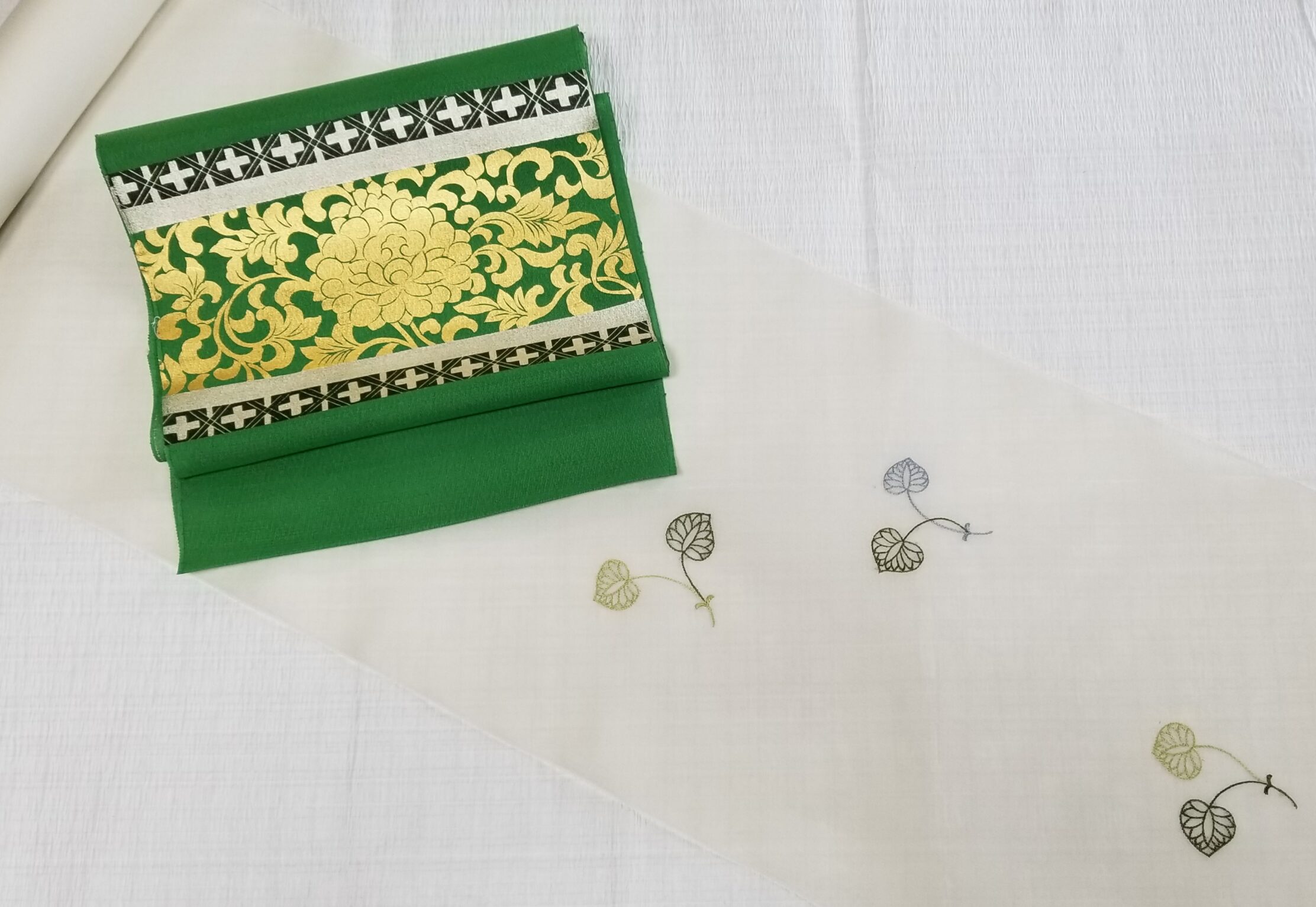 夏のお洒落に、白地のきものに帯の効かし色を持ってきて、スパッとお使い下さいな♪