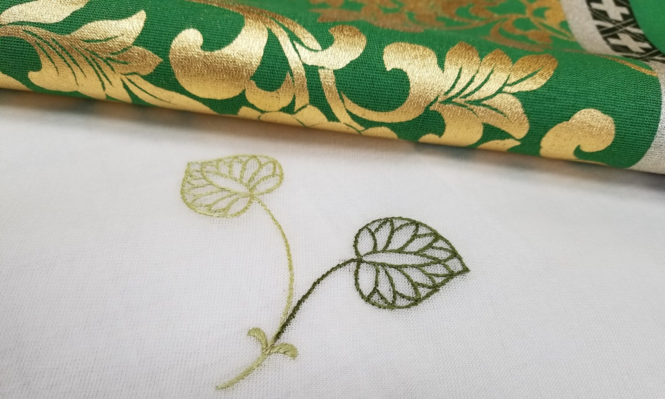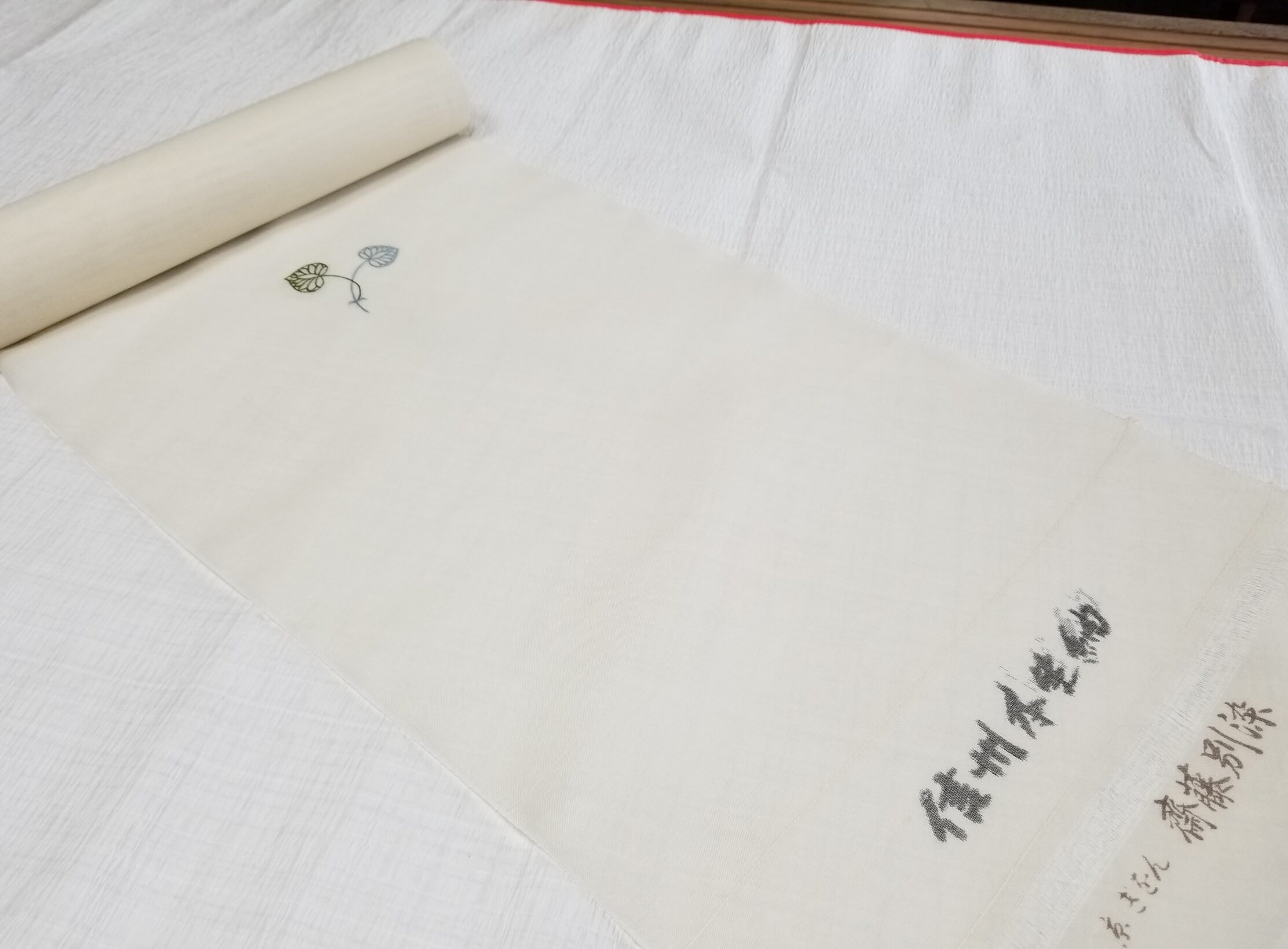 白地?生成り?生地白の信州生紬を白生地とみたてて、付下調子に葵の刺繍を散らしました!
