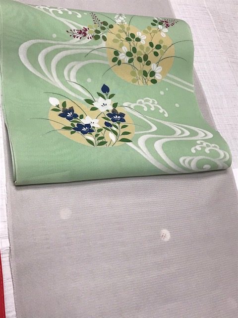 綿ぼかしの小紋に青磁色の染帯、流水に団扇を合わせてみました。