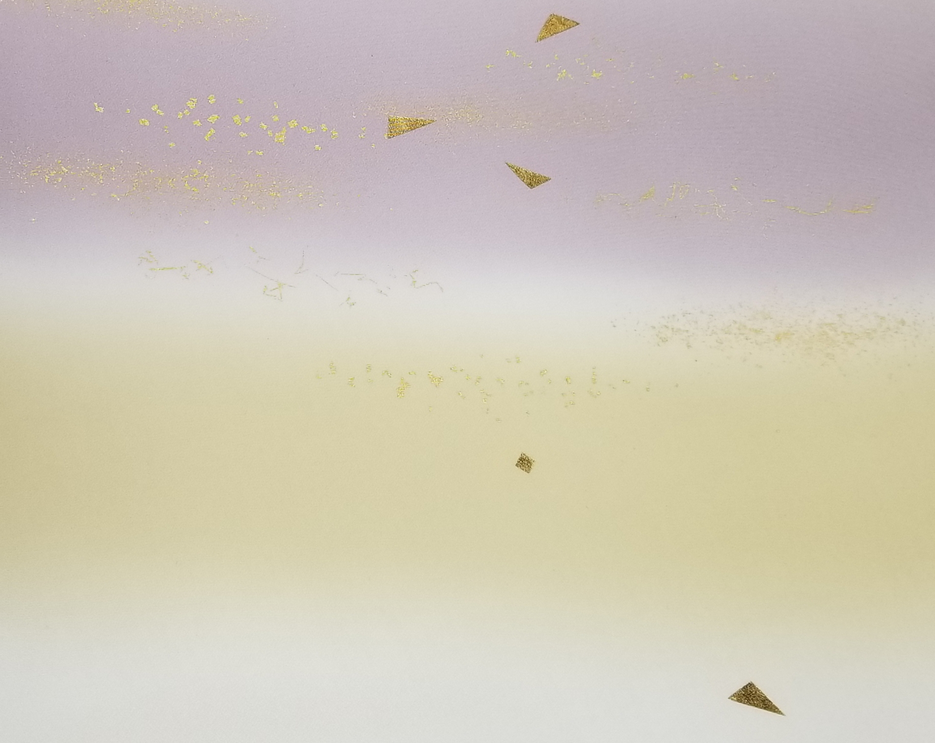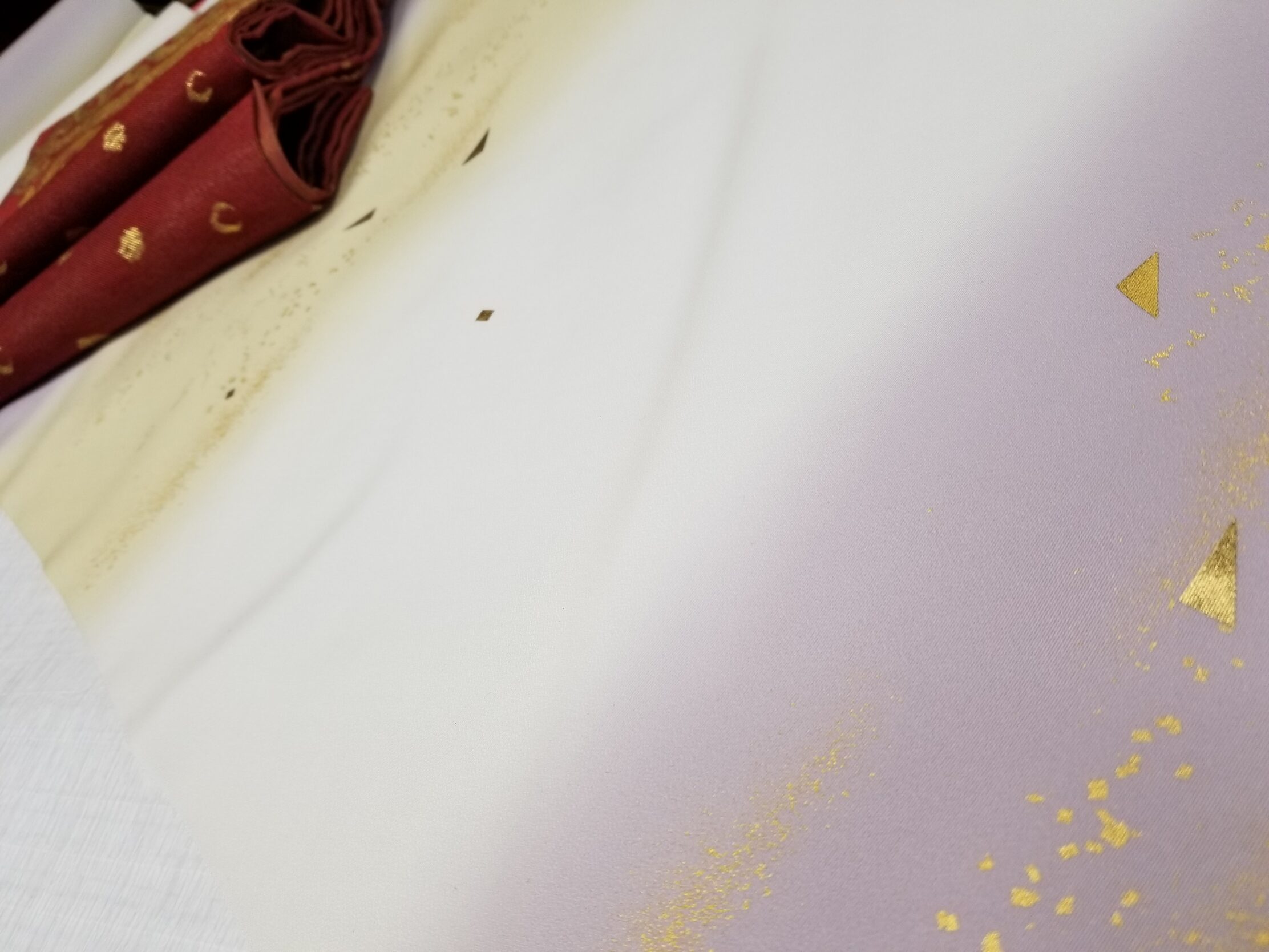 段ぼかしに切箔やまきのりでお化粧をしたきものです。