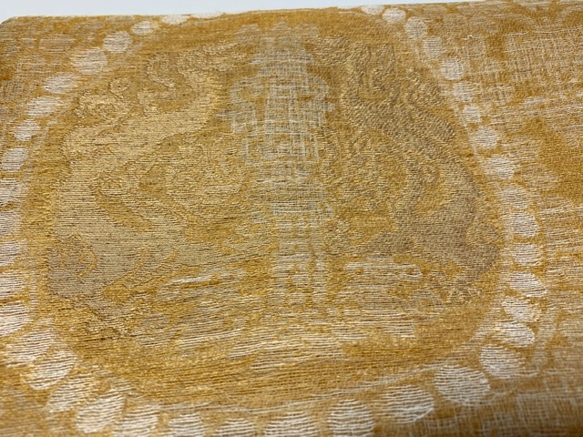 龍の丸とも呼んでまして、連珠の中に龍なのですが「雰囲気は好きなのですが龍が…」というお声をいただいた事がございましたので、じゃ一本くらい何となくで龍を前に出さない帯に仕上げても良いかと思いご用意致しました。
