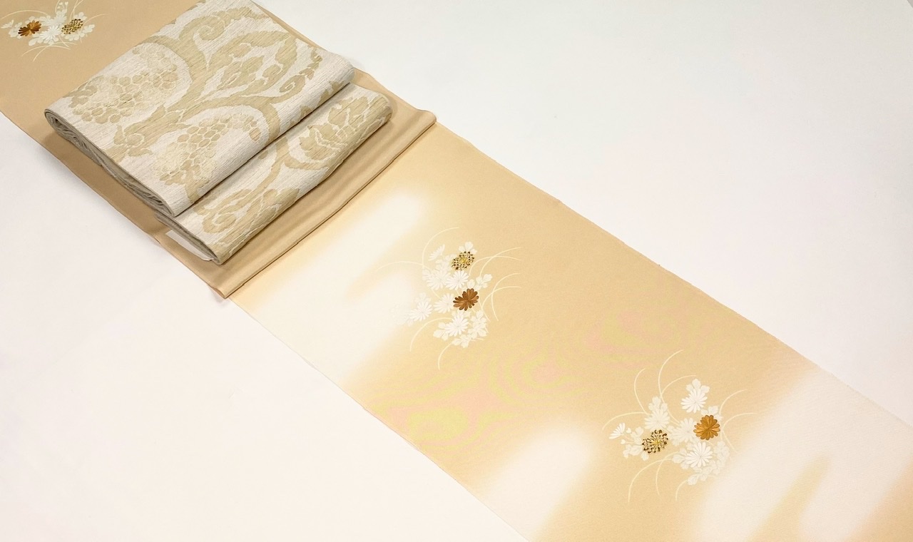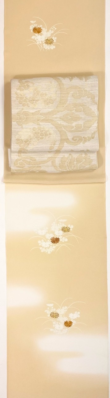 従来の御所解は訪問着としての様式美に注目し、物づくりを進めてましたが、霞ぼかしの御所解は付下訪問着として時に名古屋帯、時に袋帯をお使いいただき、お出掛け先によって使い分けていただける仕様としてご提案させていただきます。