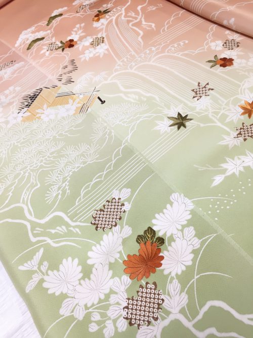 御所解を薄色でというご希望、訪問着では仰々しいというお客さまのご意見を活かし、落とし込み表現した「霞ぼかし 御所解」は弊社の物づくりに共感していただけるお客さまには、きっと♡マークをつけていただける事でしょう!!