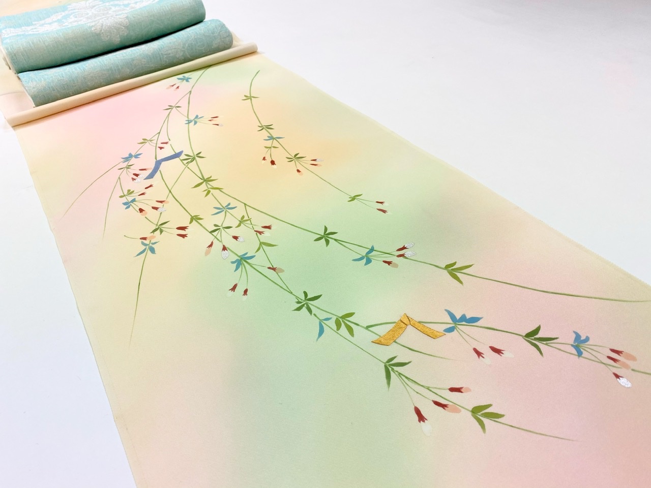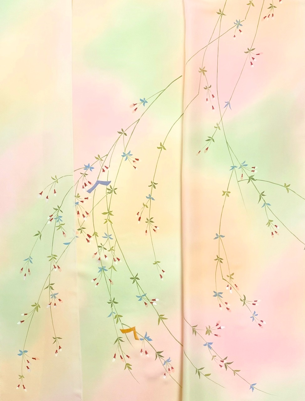 糸桜の訪問着は、もやぼかしの色目、枝垂れの流れと動きのあるものなので、