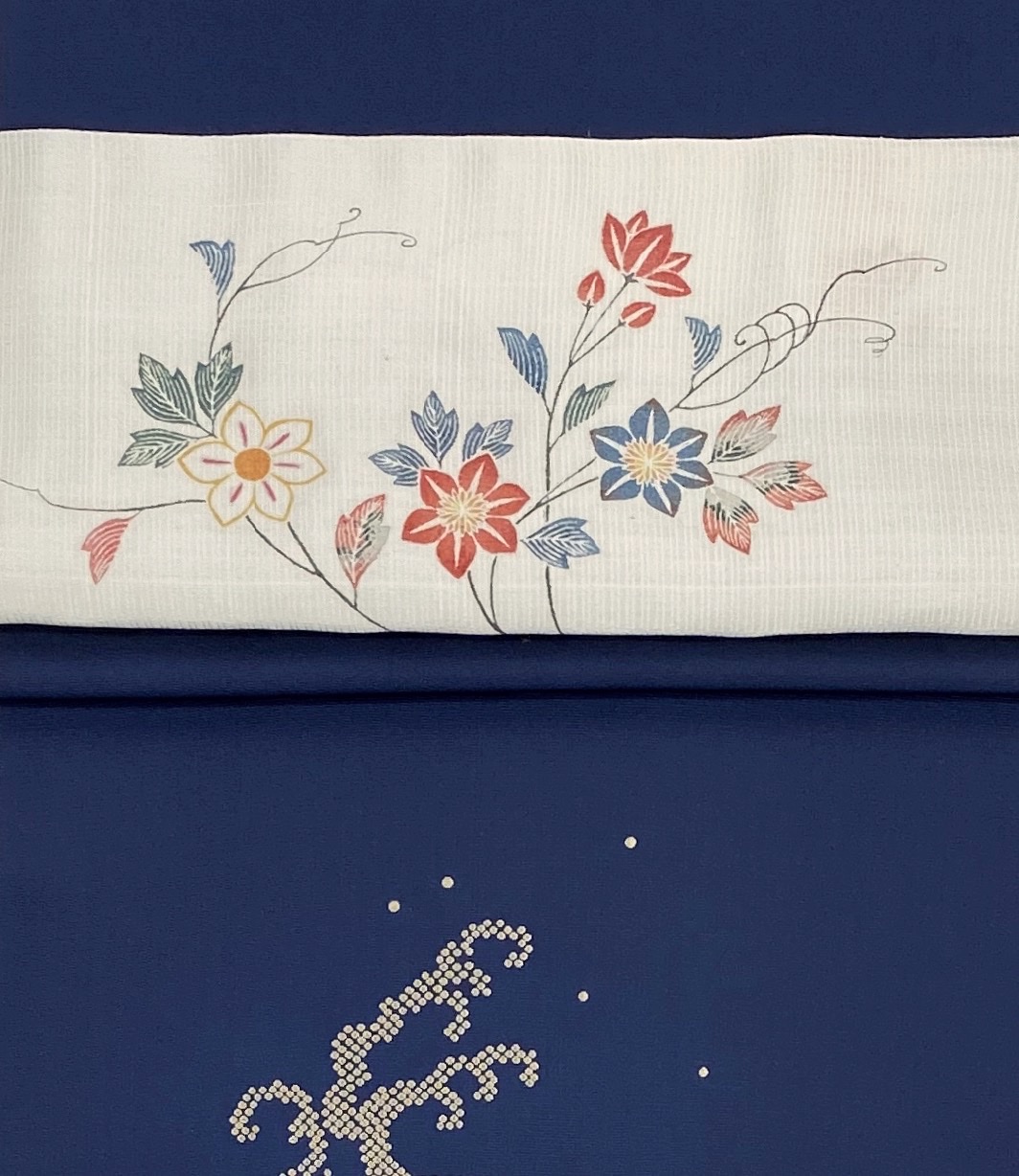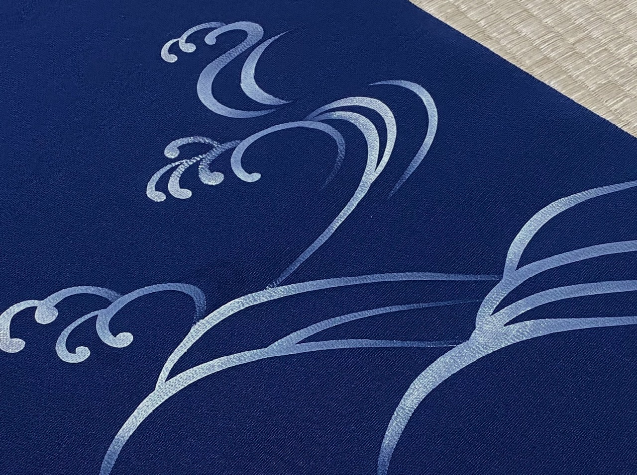 同じような濃紺で波模様で友禅ぼかしで仕上げた付下もラインナップしてますが、今回は敢えて弊店のこだわりの刺繍で仕上げた波縫い付下をご覧いただこうとチョイスしました。