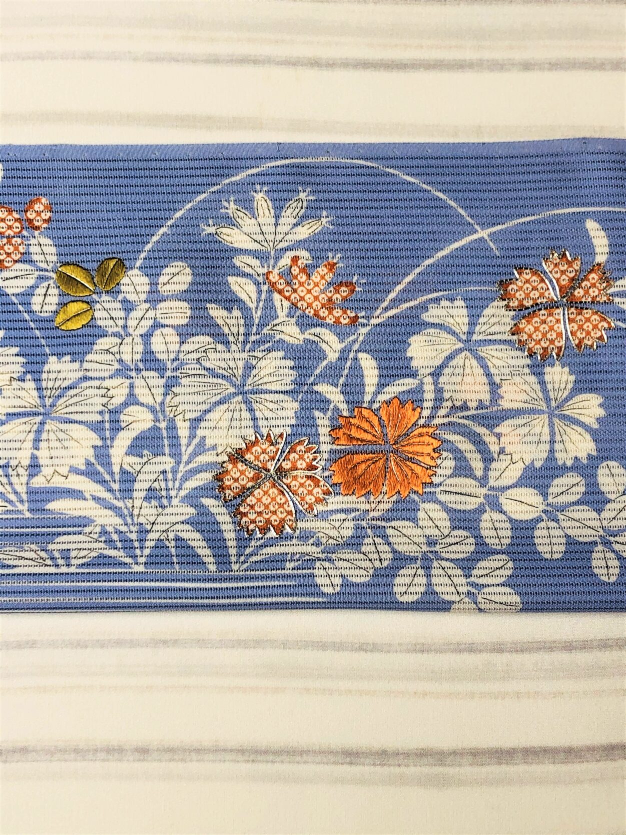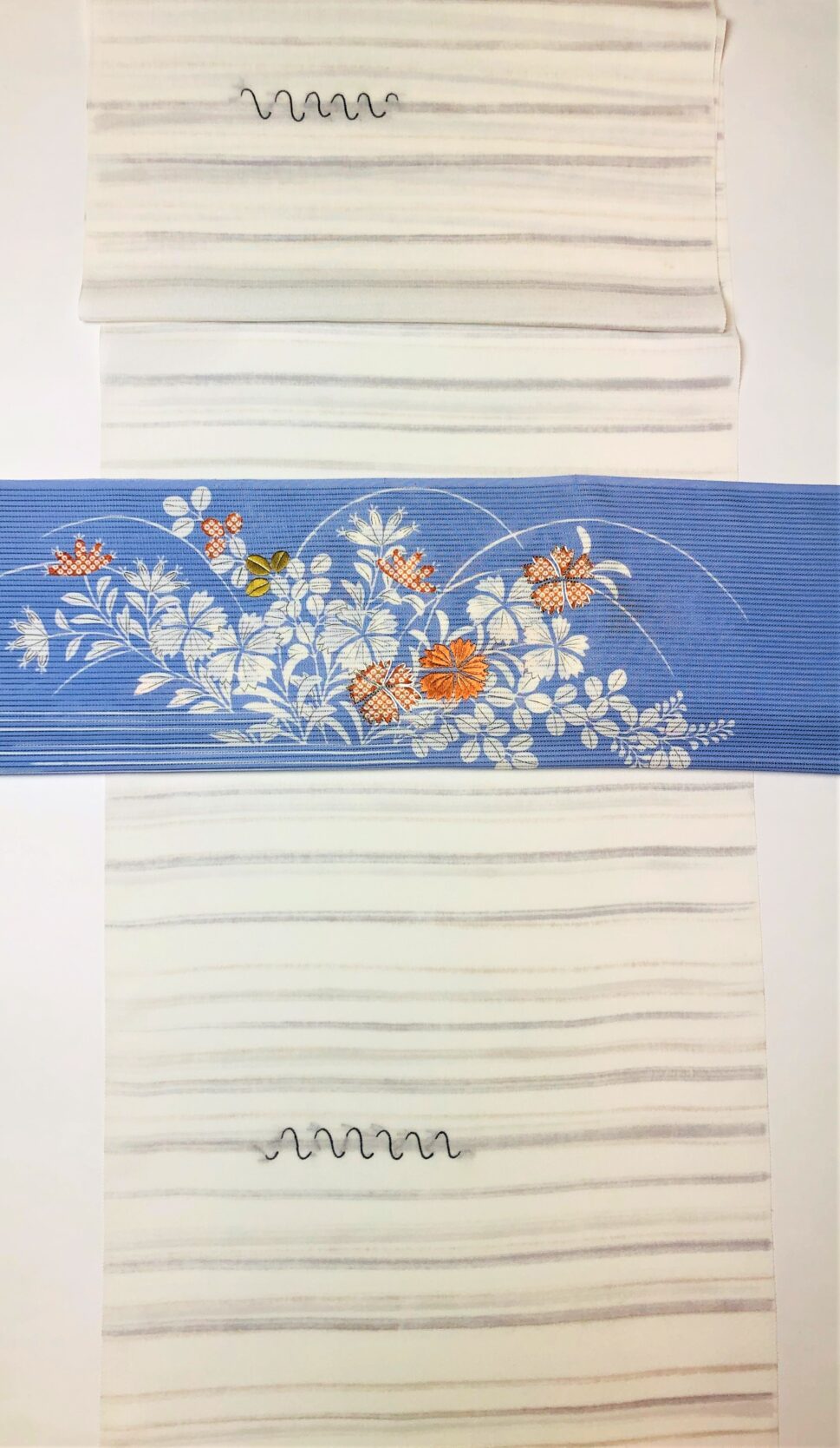 着物の地色は生成り、それに合わせる帯の色目は涼し気な水色を選択しました。