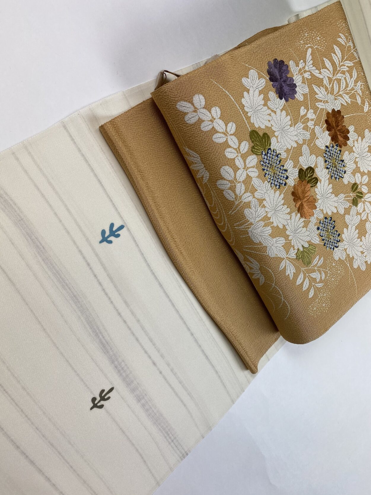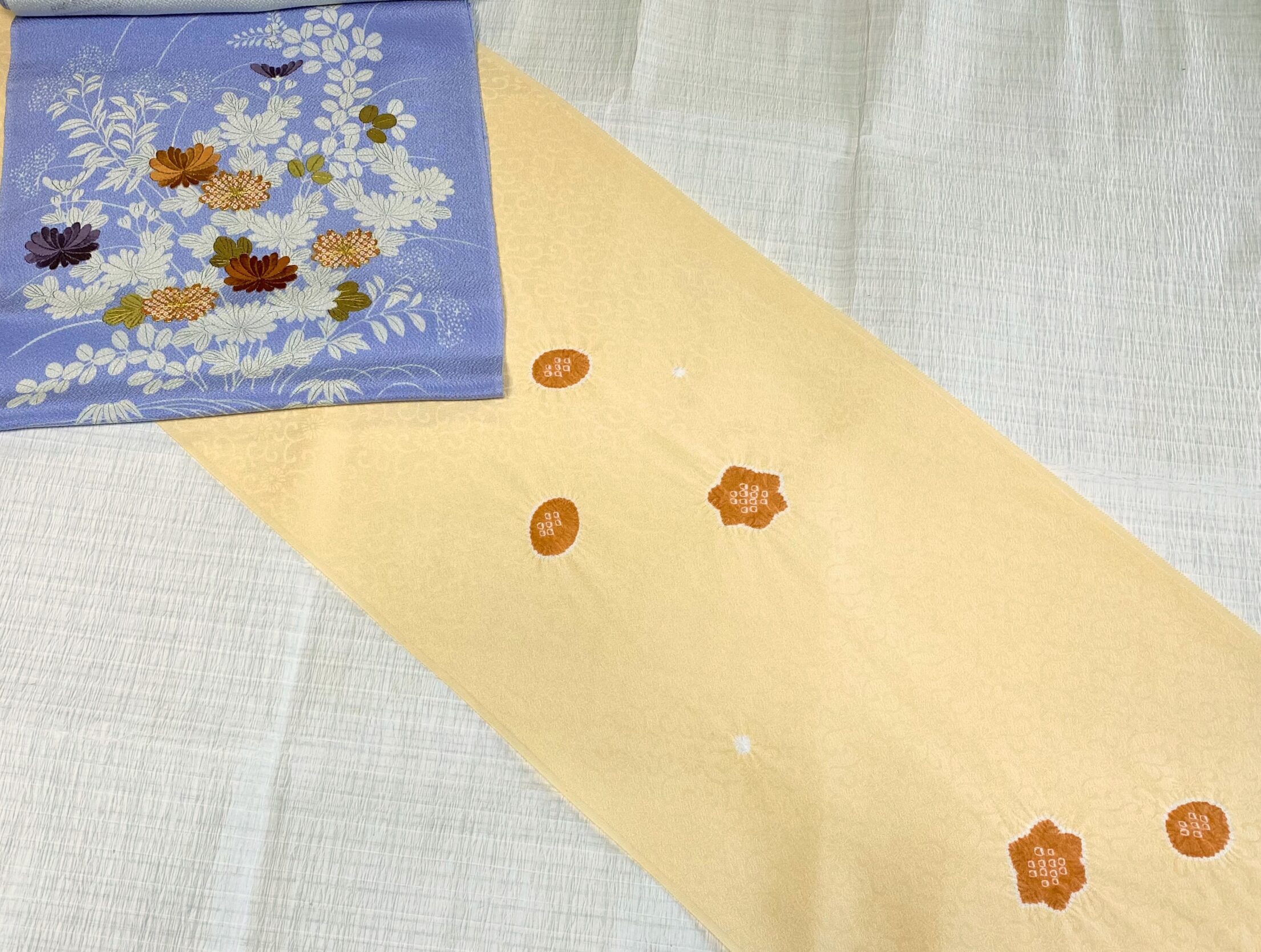お品物も新作がいろいろ仕上がってきてますが、陳列会にてお披露目が多いので今回は御所解の着物や帯をご覧下さい♪