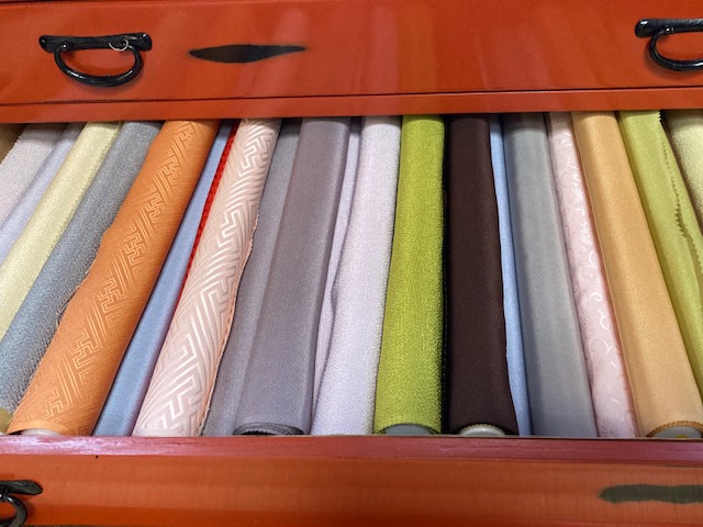 店の朱箪笥には、帯締めや帯揚げの他にコートや色無地などを、