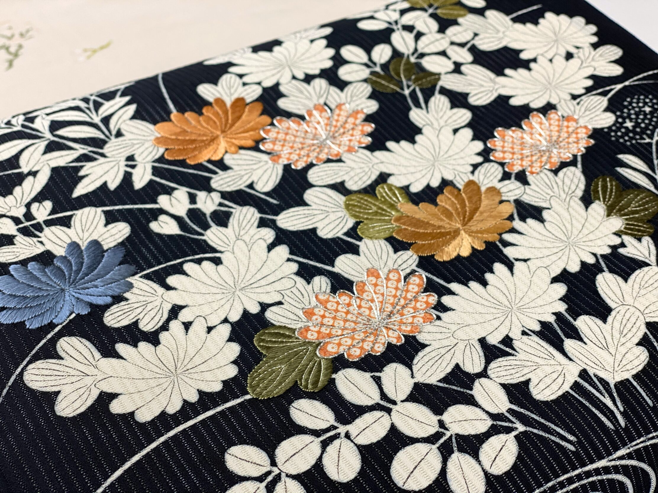 この御所解染帯は通常紫を入れている刺繍の箇所に藍色を入れて仕上げてあるレアな1本です。