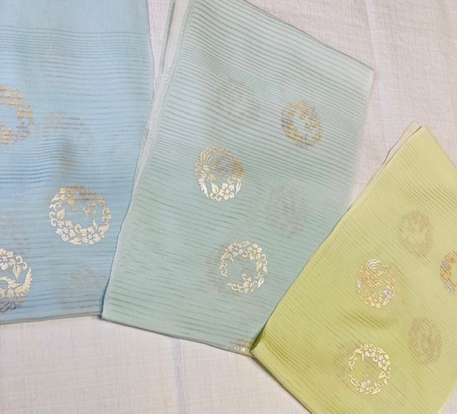 夏の帯揚げご紹介です。 水色、青磁、鶸色の三色、鳳凰と唐花を金彩で 品良く仕上げてます。