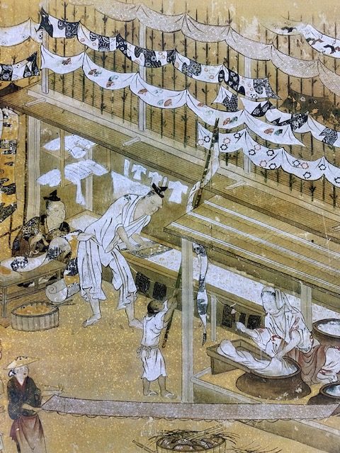 下画像はその型置師(カタオキシ)を描いた絵で、板の上に張った反物に型を用いながら柄を摺りだしている様子がうかがえます。
