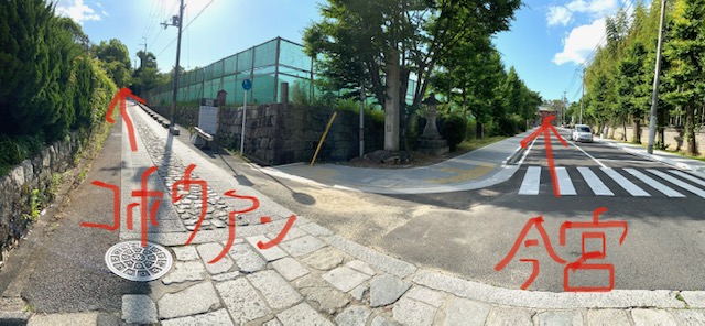 (※パノラマ撮影でちと歪んでます。実際は直角の交差点で、北進すれば今宮神社楼門、西進すれば孤篷庵というポイントから撮影。本当にすぐの距離です)