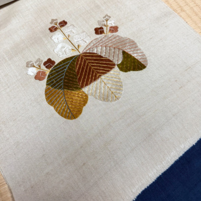 今回ご紹介するのは尾形光琳の団扇(だんせん)を夏染帯として再生した作品。