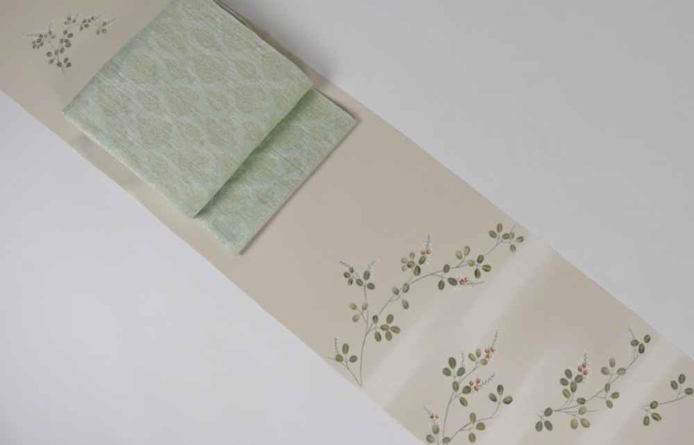 お洒落袋帯の感覚でコーディネートした齋藤織物の緯錦 木立紋