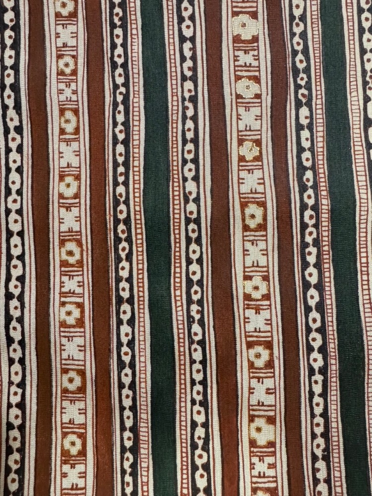 色とりどりの縦縞、また太細の線とその手成りの緊張感で、更紗独特の雰囲気がある。