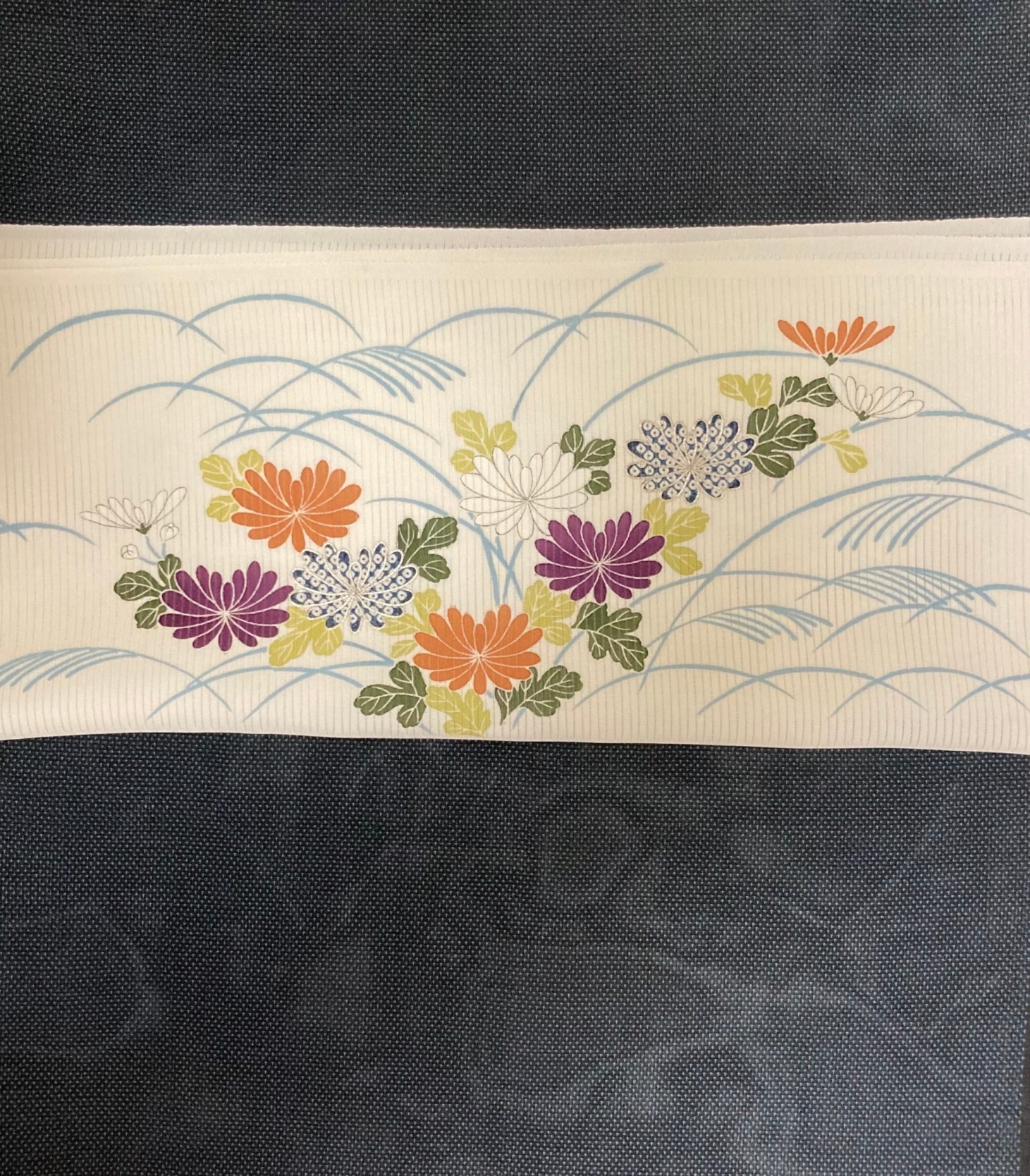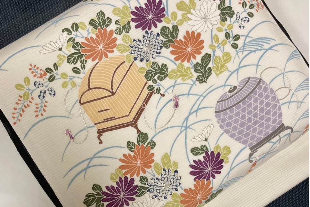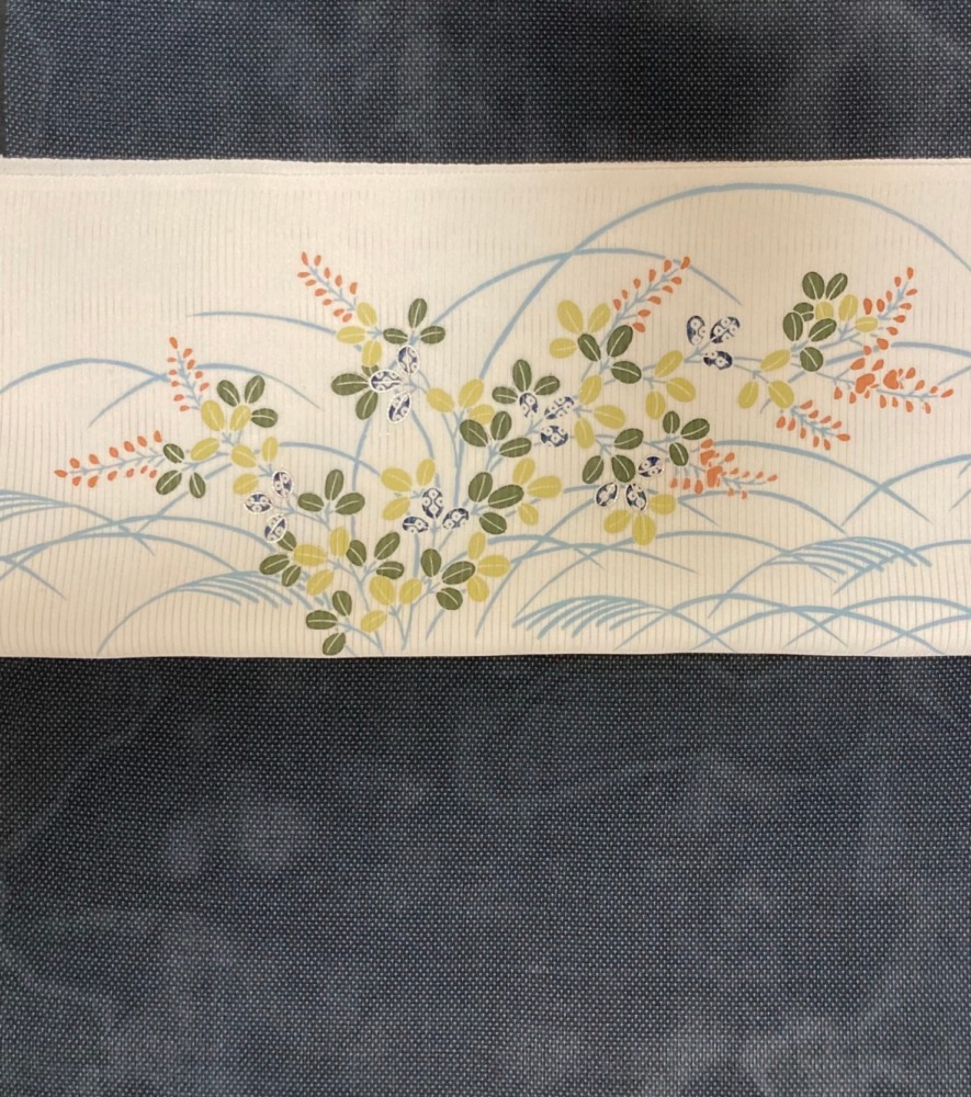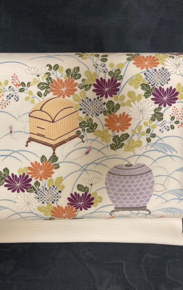 帯の素材は駒絽、白地の御所解帯虫籠です。