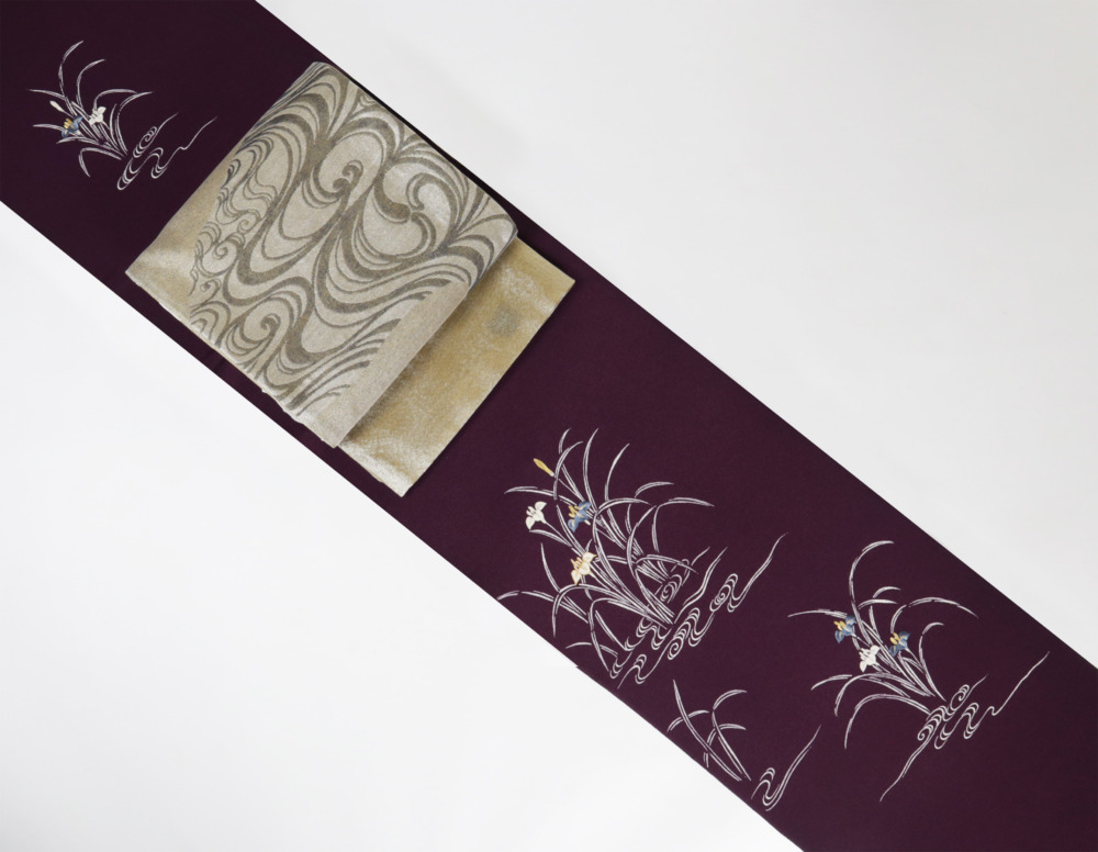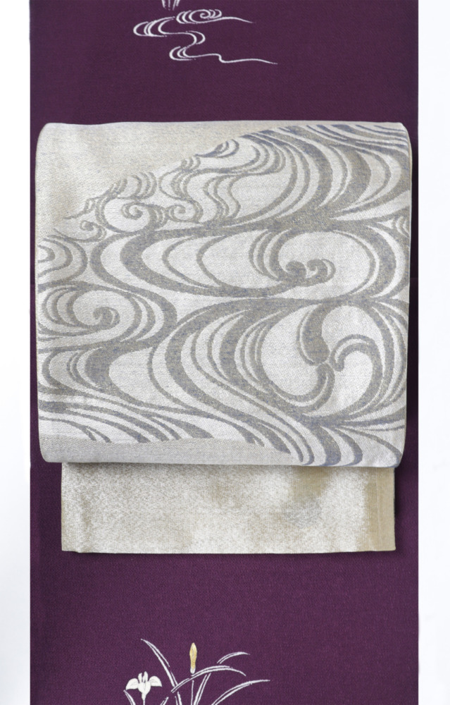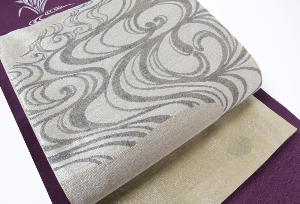 デザイン性の優れた琳派の流水を、箔に墨書きで仕上げた様に手織りで表現した袋帯です。