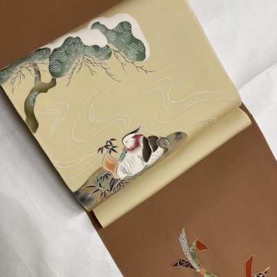 無意識に渋くなってしまわないように「可愛らしさ」を意識してみました。建付けの悪い記憶の引き出しから、縮緬の帯には地紋の着物がよく合うこと、吉祥紋であれば花同士で柄が重ならないことなどを思い出しながら合わせてみました。冬の景色のように、白上げの松竹梅が雪を被って、周囲…