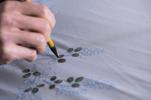 We take as our mission the effort to faithfully recreate traditional kimono wear in not only the pattern and color tone, but also every other aspect from materials to technique, and to even surpass the high standard of technique in our predecessors. Because we consult with specialist artisans for each of the numerous production processes necessary to manifest ideas into a finished product, from fabric matching to fabric color, pattern design, yuzen dyeing, shishu embroidery, and kinsai gold decoration, projects can take some time to complete. This is, of course, however, a simple necessity on our quest to imbue each step with the apex of quality produced by human hands.