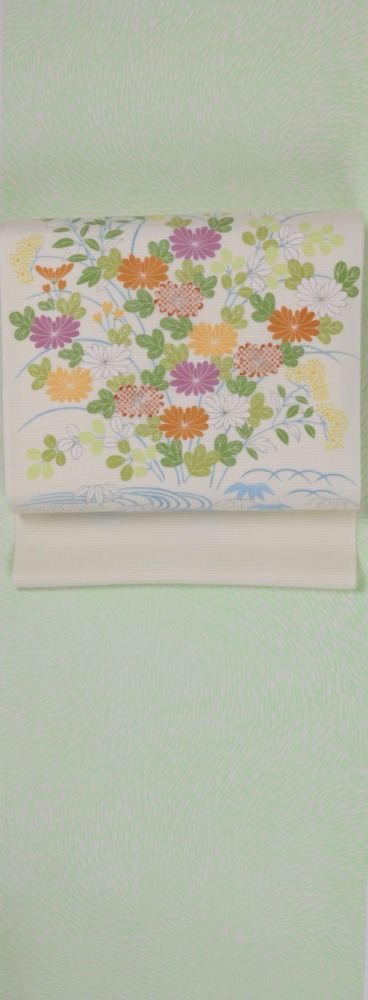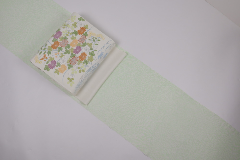 御所解染帯は、地色に対して白抜きで柄を浮き立たせる技法を用いて染め上げる事が多いですが、今回は白地に対して友禅で柄を浮き立たせ、摺り疋田、銀駒刺繍を