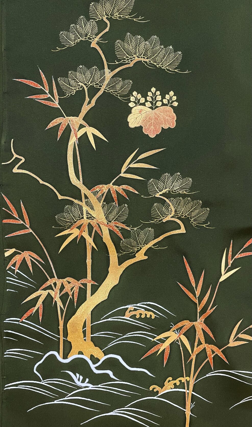今回はその技法を主とした訪問着を制作した、柄は蒔絵と同じく老松に笹、