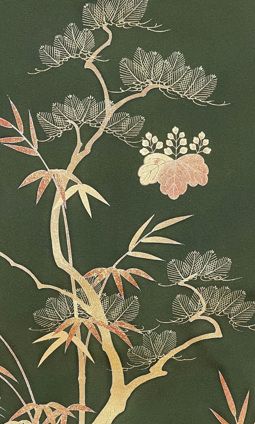 よくご覧いただくと笹や老松の木には地色に濃い朱が施され、金の箔と相まって