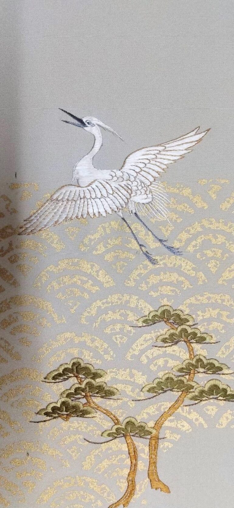 金銀の摺箔で施され、上には白鷺、裾には浜松が慶長の名残を想わせる縫いで優美に表現されている。