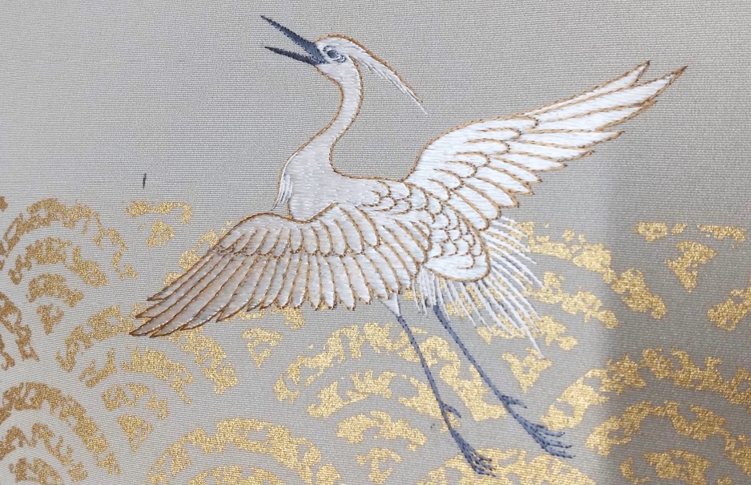金と銀を使い分け絶妙な濃淡で変化をつけ、その色調に合わせて刺繍の色合いもまた変えているのがわかる。