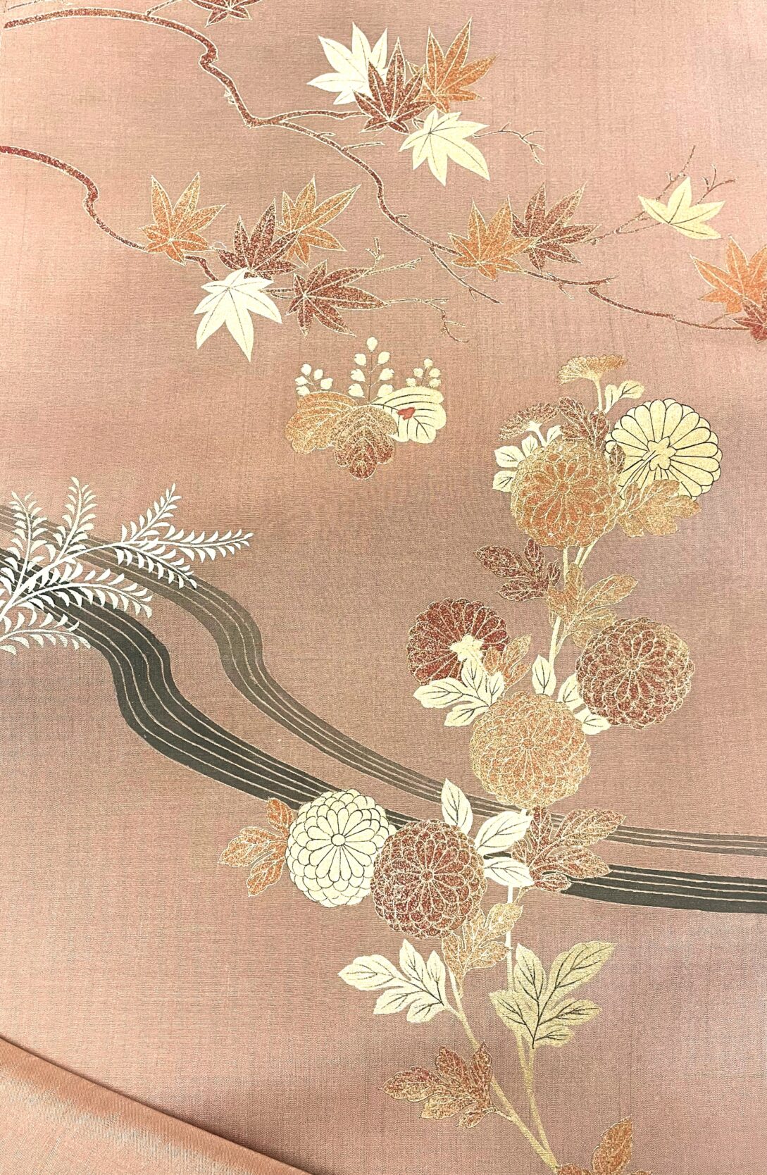地色は朱茶、顔料で菊や桐、紅葉の朱を基調に表現し、あとはそのすばらしい