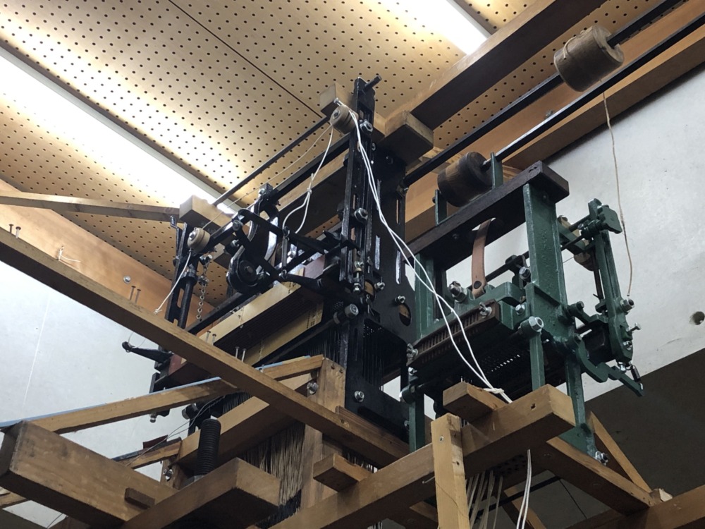 写真左側の黒い機械です。紋紙を回し、針を上げる役割があります。