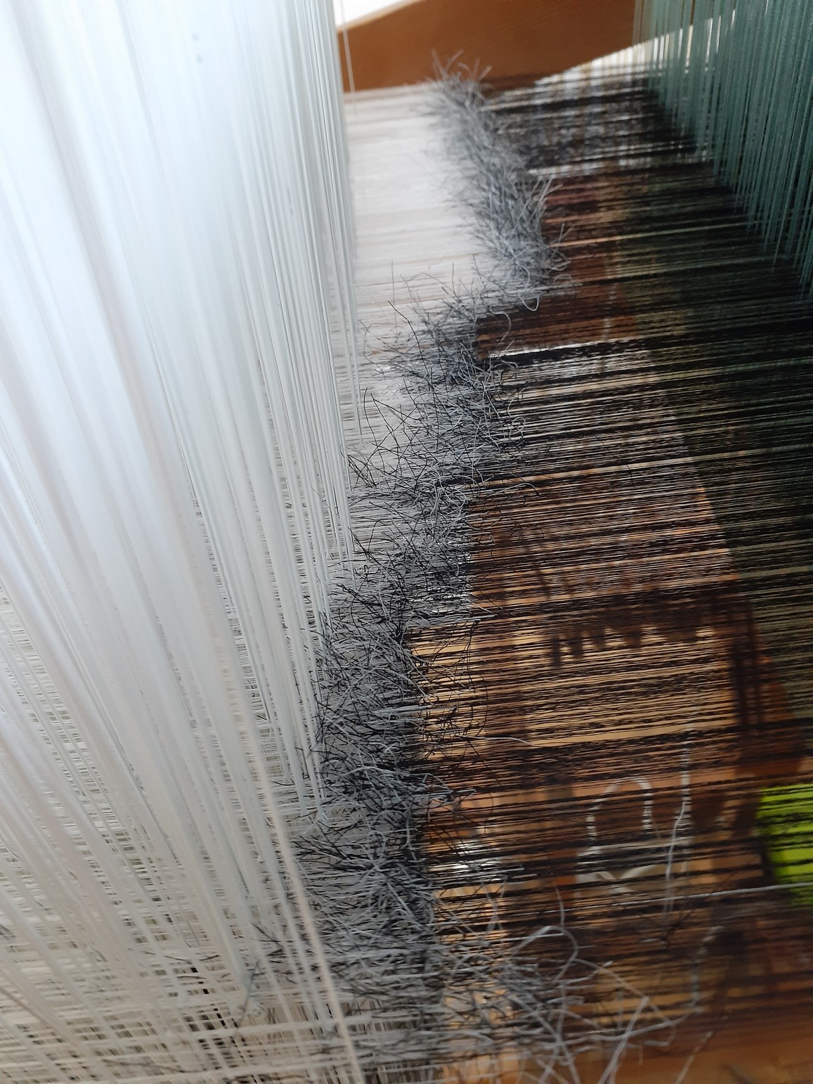 手前の黒い方が古くて、白い方が新しく織る経糸です。