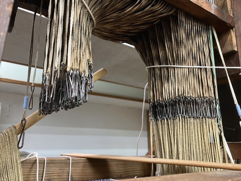 取り外す前に、竜頭(S字管のついた紐)からツウジ(経糸の通ったソウコウを吊っている紐)を順番通りに外していきます。
