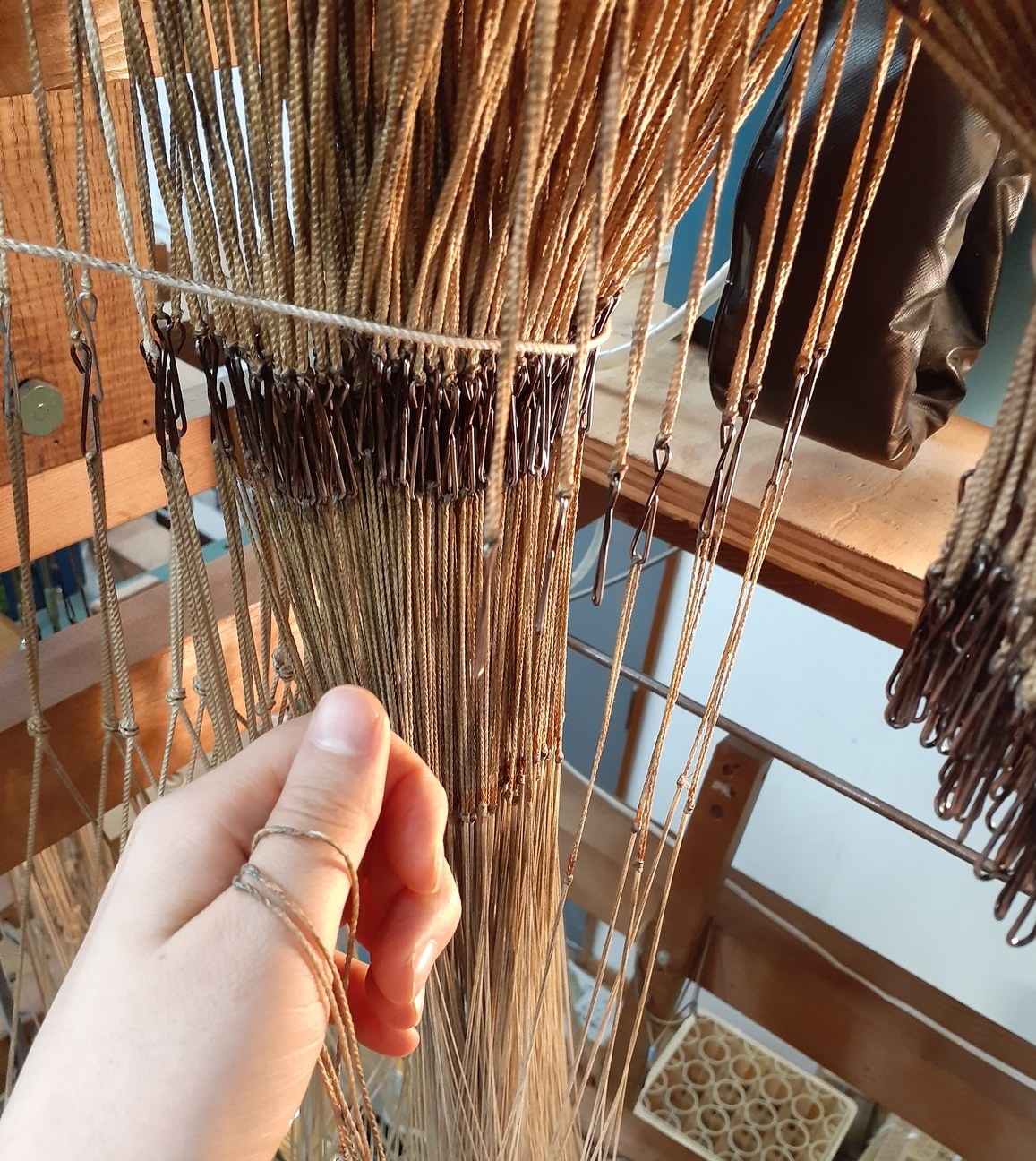 新しい仕掛けを逆の手順で吊りなおし、スムーズに織れるよう、全体を微調整していきます。