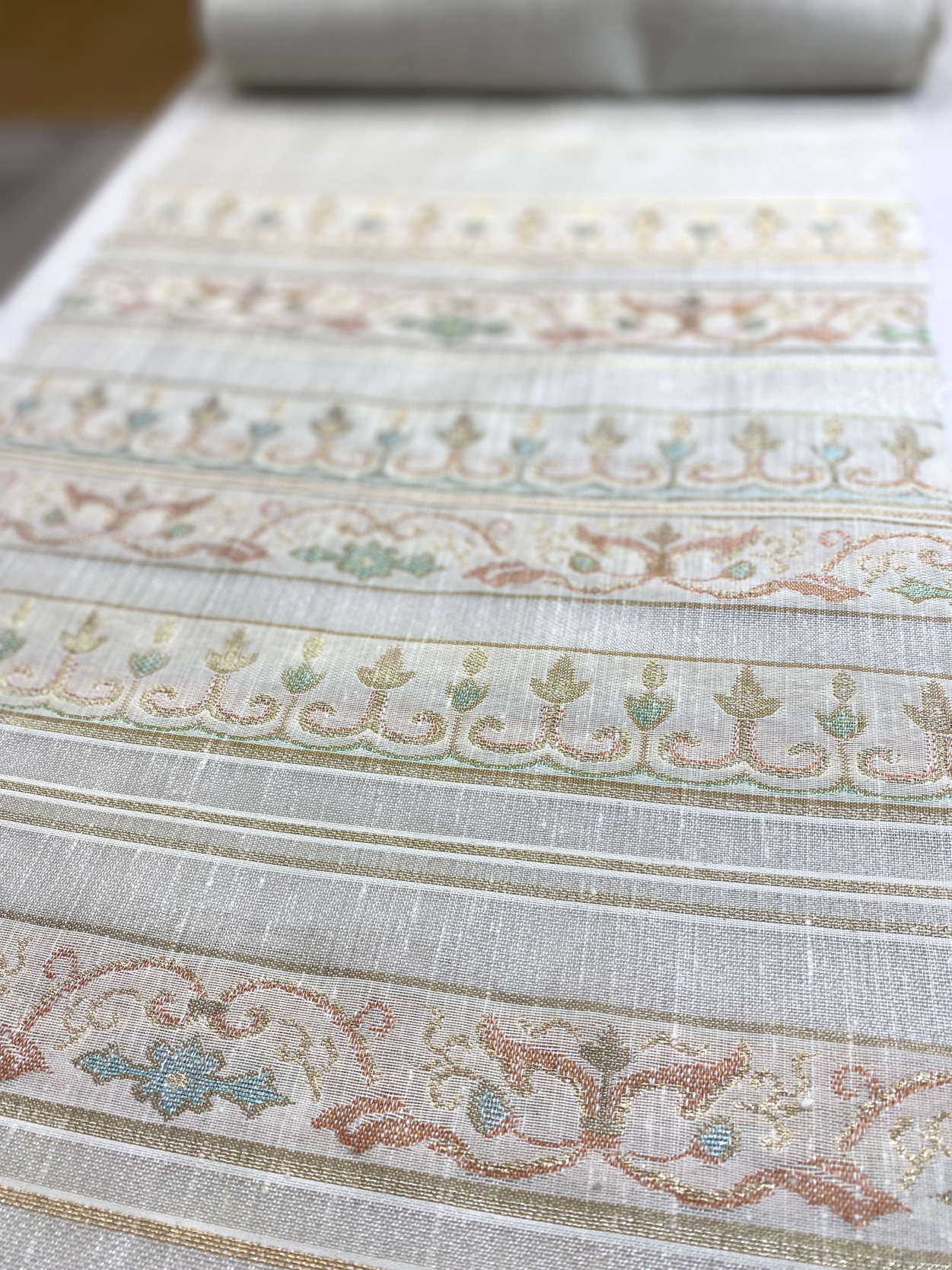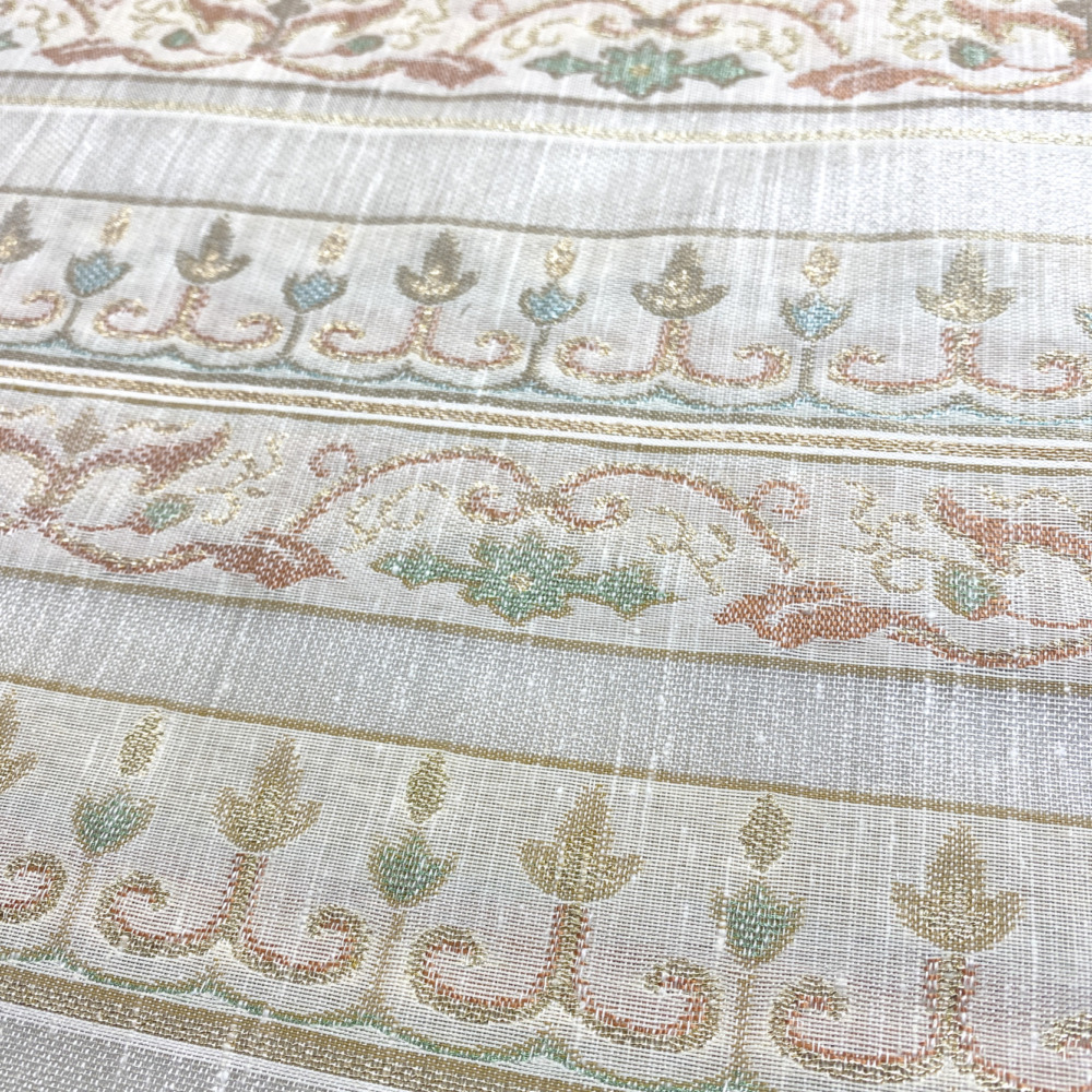 垂飾風の華文と唐草、2種類の柄を交互に配した帯です。