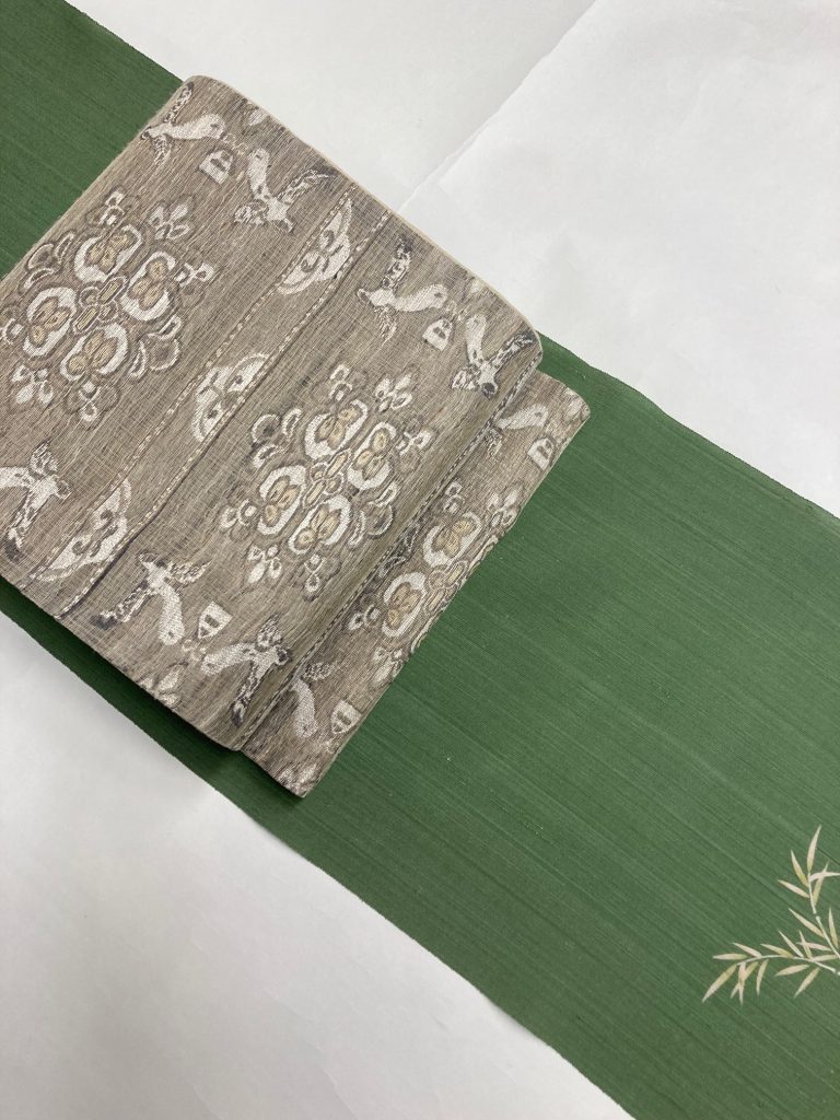 今月の着物と帯は、生紬に竹と筍を描いた着物に苧麻を使った袋帯を合わせてみました。