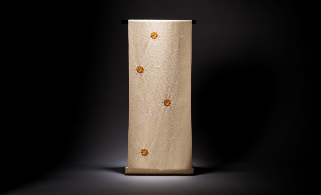 まず着物はクリーム色の菊絞り小紋、生地は菊唐草の綸子を使用し