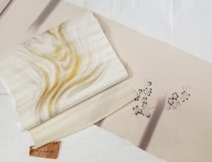 きものは薄物の素材に霞ぼかしを入れ、その霞を活かして辻が花の墨描きを付下げ調に配しました。