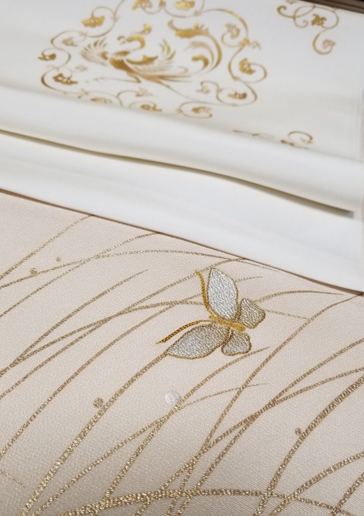 蝶には金駒刺繍、露芝の上には水玉が刺繍と金彩で表現されてます。