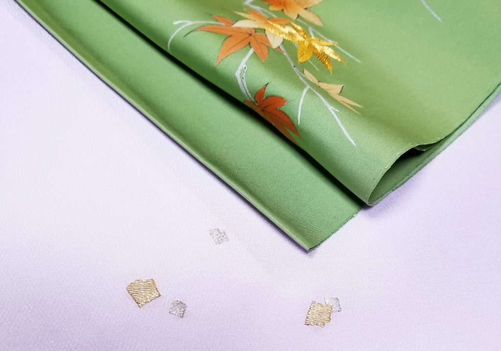 紅葉には、金駒刺繍、友禅ぼかしの後に墨描きで抑揚をつけて仕上げてます。