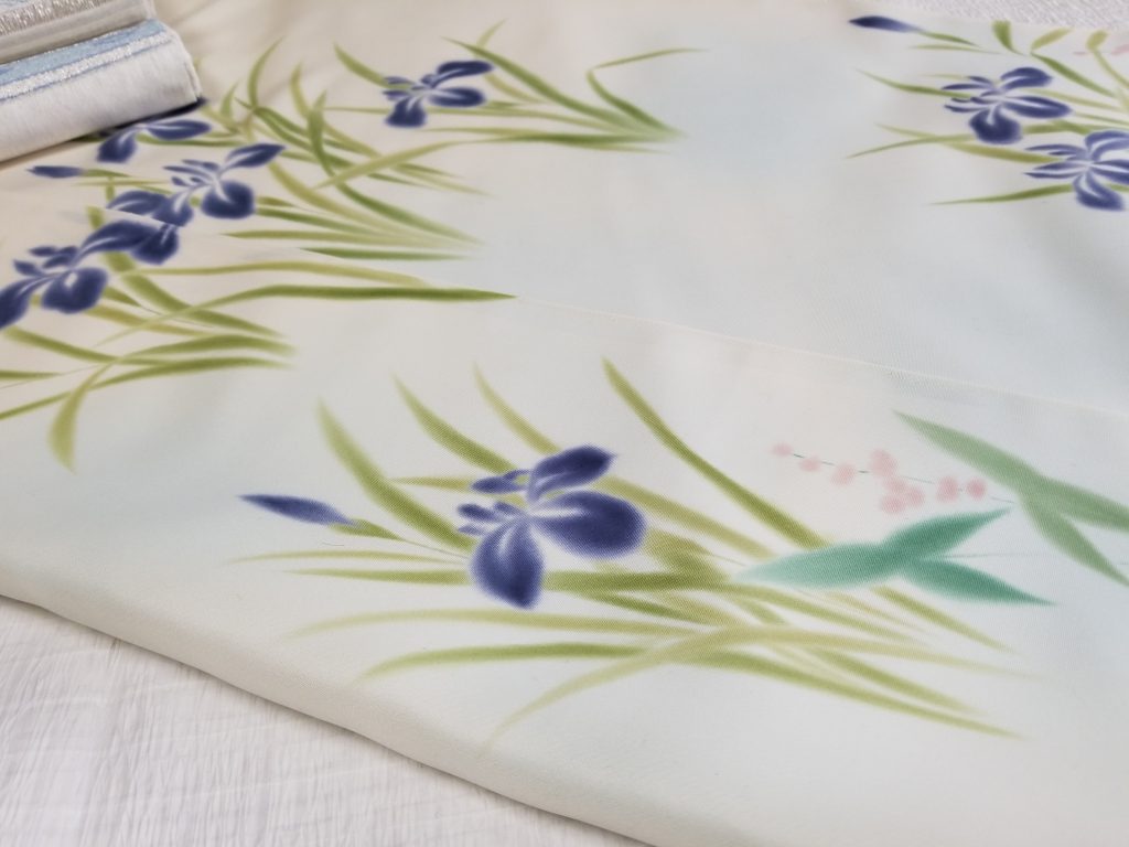 生成り(薄クリーム地)の地色に裾には、薄っすら水色で流水に見立てて「水色ぼかし」を入れてますがご確認いただけますか?