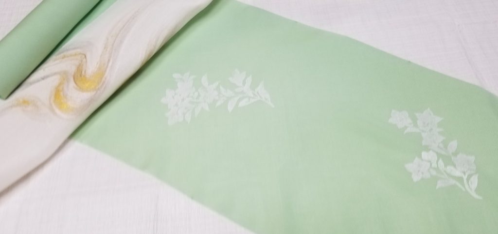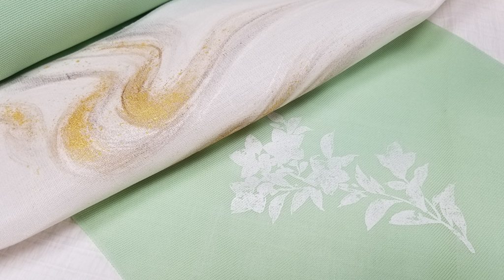 夏着物の付下には桔梗を銀彩の加工で仕上げてございます。