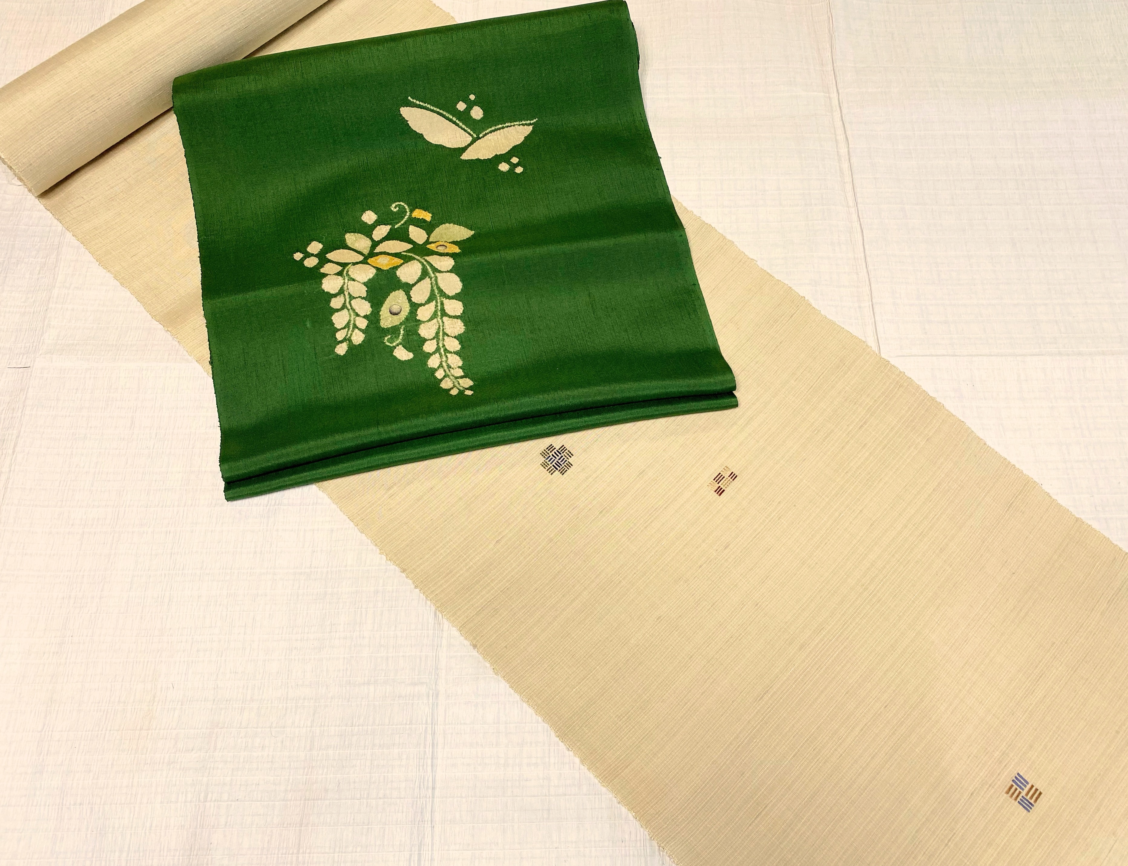 明日は4月1日 HPのきものと帯では摺絵 摺箔の菖蒲の帯をコーディネート致します♪