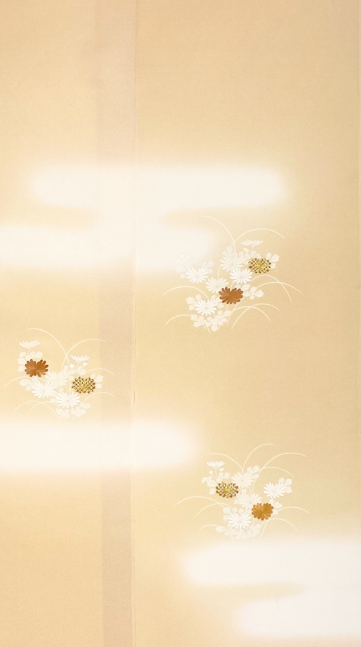 ベージュで染めた霞ぼかし御所解で、数反目となりますが、これまではより透明感を意識してキレイ目で仕上げてましたが、今回は落ち着きある色、いわゆるベージュ系で刺繍もこれまでのものより気持ち濃くしました。濃く仕上げていくと、いつもの御所解に近づくのですが、訪問着では無く、付下というのもキーワードで霞ぼかしのやわらかさもしっかり演出できてますので「良し!」と思ってます。